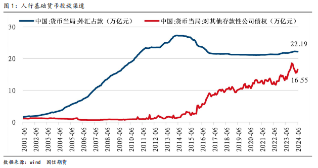 外汇占款余额相对稳定。2001年开始,随着中国加入世贸组织,中国出口稳步增长,外汇占款也逐步升高,至2014年达到峰值。但是,外汇占款作为货币投放渠道的主要问题在于,人行的货币发行主要由出口形势以及人民币汇率决定,进而间接受到主要贸易伙伴的国际贸易政策以及海外央行货币政策的影响,致使人行的控制力相对较弱。因此,2014年后,人行为了提高货币发行的相对稳定,逐步提高了“对其他存款性公司债权”的使用,外汇占款在达到峰值后缓慢下降。2024年6月,人行资产负债表中,资产总额为43.65万亿元,其中,外汇占款为22.19万亿元(占比50.84%),对其他存款性公司债权为16.55万亿元(占比37.92%)。