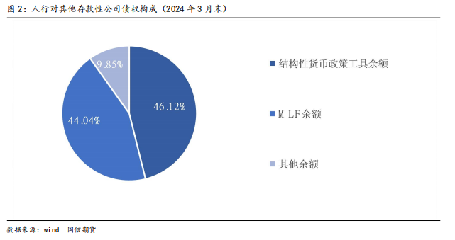 对其他存款性公司债权重要性相对提升。这项货币投放渠道,主要是人行对商业银行等存款机构进行再贴现再贷款、公开市场操作(MOM、MLF、PSL、SLF等)以及结构性货币政策工具等产生的债权。根据人行数据,2024年3月末,货币当局对其他存款性公司债权为16.35万亿元,其中结构性货币政策工具余额为7.54万亿元(占比46.12%),MLF余额为7.20万亿元(占比44.04%),其他为1.61万亿元(占比9.85%),结构性货币政策工具和MLF的作用较为突出。