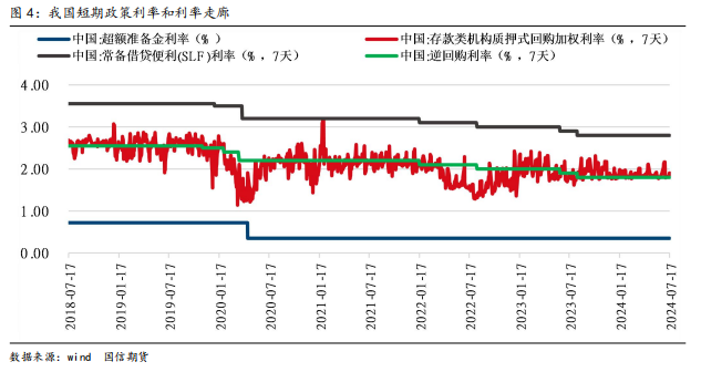 增设临时正逆回购,侧重优化利率传导。相比于人行借入国债,主要针对防风险及可能的新设货币投放渠道;人行增设临时正逆回购,或主要针对进一步优化政策利率传导机制。2024年7月22日,根据人行官网消息,公开市场7天期逆回购操作利率由此前的1.80%调整为1.70%。同日,中国人民银行授权全国银行间同业拆借中心公布,2024年7月22日贷款市场报价利率(LPR)为:1年期LPR为3.35%,5年期以上LPR为3.85%;即1年期和5年期以上LPR分别调降10个基点。从操作规律上看,暗含新操作思路。7月15日,中期借贷便利(MLF)利率未做调整;人行或借由新设临时正逆回购与7天逆回购的挂钩操作,明确7天逆回购利率作为政策利率的功能,进而逐步淡化MLF对LPR的引导作用。利率走廊方面,当前人行以常备借贷便利(SLF)和超额准备金率作为利率走廊上下限,但是上下限幅度较宽,目前在245个基点;新设临时正逆回购,利率走廊上下限将收窄至70个基点左右,可以更为精确地发挥政策利率的引导和信号作用,提升利率传导效率。