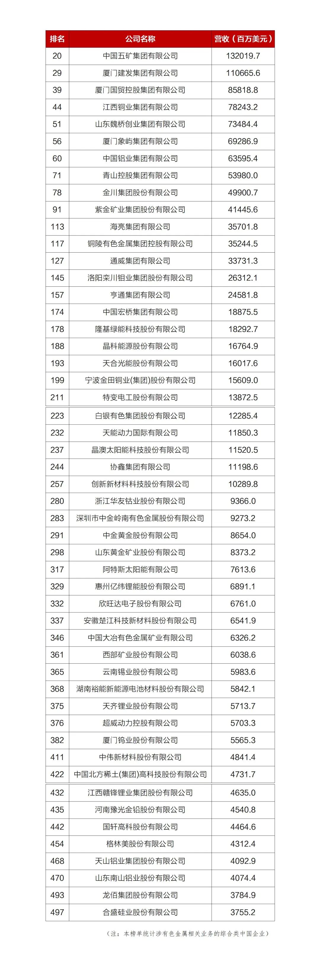 该榜单覆盖上市及非上市中国企业,沿用《财富》世界500强评选标准,展现中国龙头企业的最新风貌。其中,中国五矿集团位居第20位,江西铜业集团、山东魏桥创业集团、中国铝业集团、金川集团股份有限公司、紫金矿业集团股份有限公司等跻身前100强,展现了我国有色行业的强大竞争力。