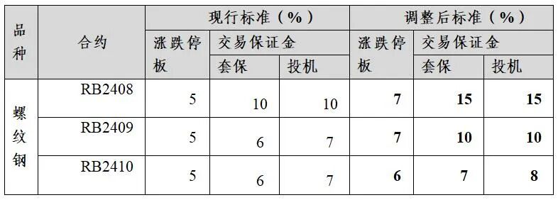 公告显示,自2024年7月31日(周三)收盘结算时起,螺纹钢RB2408合约的涨跌停板幅度调整为7%,套保交易保证金比例为15%,投机交易保证金比例为15%;螺纹钢RB2409合约的涨跌停板幅度调整为7%,套保交易保证金比例为10%,投机交易保证金比例为10%;螺纹钢RB2410合约的涨跌停板幅度调整为6%,套保交易保证金比例调整为7%,投机交易保证金比例调整为8%。