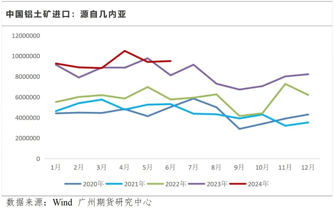 1、进口铝土矿依赖程度高且来源国高度集中,矿产主流供应国几内亚进入雨季后续发运或存干扰,8-10月为几内亚进口低谷期,目前国内铝土矿正逐步复产,整体上看铝土矿供应仍有走紧可能。