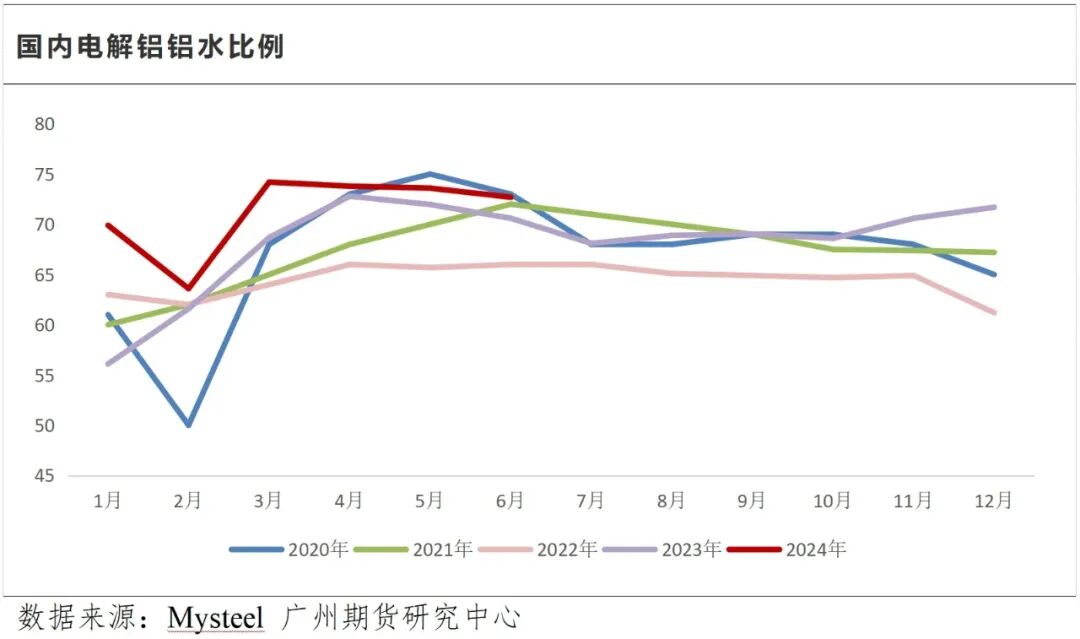 今年5月国务院发布《2024-2025年节能降碳行动方案》,7月国家发展改革委、工业和信息化部、生态环境部、市场监管总局、国家能源局联合印发《电解铝行业节能降碳专项行动计划》,提及到2025年底,电解铝行业能效标杆水平以上产能占比达到30%,能效基准水平以下产能完成技术改造或淘汰退出,行业可再生能源利用比例达到25%以上,助力铝水直接合金化率提升至逾90%。据Mysteel调研,6月国内电解铝铝水比例为72.7%,进入7月,因供增需弱,铝锭社会库存缓慢回升,而往年同期呈现去化态势,对价格形成一定利空驱动。但随着后期铝水比例的进一步抬升,预计铝锭供应难以给价格带来持续性压力。