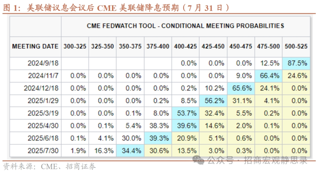 市场反应:降息预期升温提振风险偏好,大类资产普涨。FOMC决议公布前各类资产均有所上涨,在决议公布以及鲍威尔讲话后资产涨幅扩大。2Y和10Y美债盘中分别下行10.1BP和10.6BP至4.27%和4.04%;美元指数盘中下跌0.43%至104.04;COMEX黄金、WTI原油和LME原油分别收涨1.70%、5.23%和2.99%;标普500、纳斯达克、道琼斯指数分别收涨1.58%、2.64%和0.24%。市场降息预期略有升温,9月首次降息25BP概率为87.5%,11月降息25BP概率为66.4%。