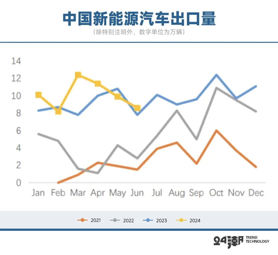 尤其是,由于地缘政治和贸易保护等原因,我国新能源汽车出口受限现象较为严重,据中国汽车工业协会(CAAM)口径数据统计显示,2024年1-6月国内新能源汽车出口60.5万辆,同比增长13.2%,而去年同期增速为154.97%。