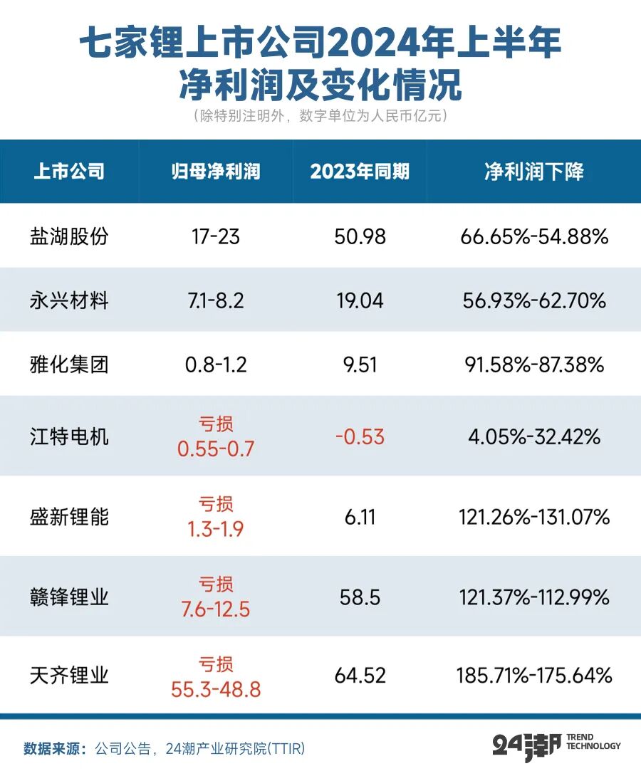 另据24潮产业研究院(TTIR)统计,目前已发布2024年上半年业绩预告的7家锂上市公司盈利能力全线巨降,上半年合计亏损(归母净利润)39.85亿元-31.50亿元,同比下降了121.86%-112.42%,其中锂矿双雄中的天齐锂业亏损55.30-48.8亿元,赣锋锂业则亏损7.6-12.5亿元。