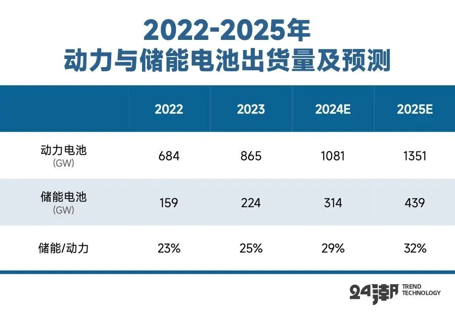 另据研究机构EVTank联合伊维经济研究院共同发布的《中国锂离子电池行业发展白皮书(2024年)》显示,2023年,全球锂离子电池总体出货量1202.6GWh,同比增长25.6%,增幅相对于2022年已经呈现大幅度下滑。从出货结构来看,2023年,全球汽车动力电池(EV LIB)出货量为865.2GWh,同比增长26.5%;储能电池(ESS LIB)出货量224.2GWh,同比增长40.7%。根据历史数据假设假储能电池增速未来两年保持40%增速,动力电池保持25%增速,到2025年动力与储能电池出货量如下: