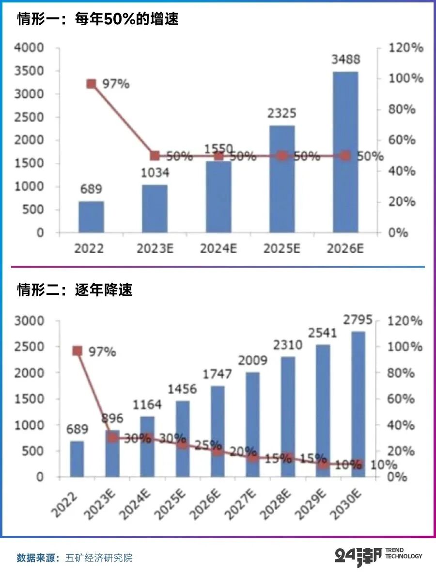 五矿经济研究院认为,2022年我国新能源汽车渗透率已经达到25.6%,如果每年都保持100%的增速,2024年就基本将实现100%渗透;如果每年增速降至50%,也将于2026年实现100%渗透。更合理与现实的发展趋势是增速不断下滑,增速下滑与加速渗透并不矛盾。