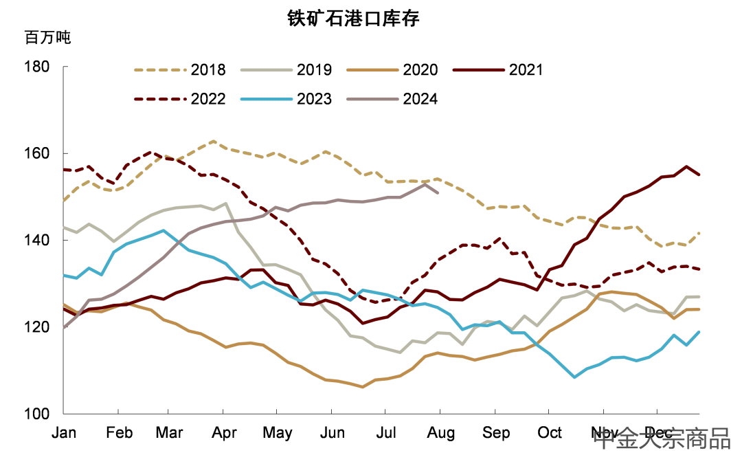 铁矿:钢厂盈利压力下,铁水产量持续回落。钢厂盈利比例快速下滑至6.5%,是2015年以来新低。从供给端来看,最新一周铁矿石到港环比有比较明显的下滑,港口库存亦有小幅回落。但从铁矿石发运量看,尽管进入三季度以后矿山发运或有一定放缓,但7月以来全球铁矿发运仍然有同比2.2%的增长,其中澳矿发运同比基本持平,巴西矿和印度矿则维持同比增长。根据我们中国到岸铁矿的平衡表,今年三季度港口库存可能仍居高位。即便供给侧发运放缓,当前水平的铁水产量可能并不足以扭转港口库存的回升趋势。从全球供需的增量平衡来看,我们预计三季度铁矿供需基本平衡,四季度可能将继续过剩。