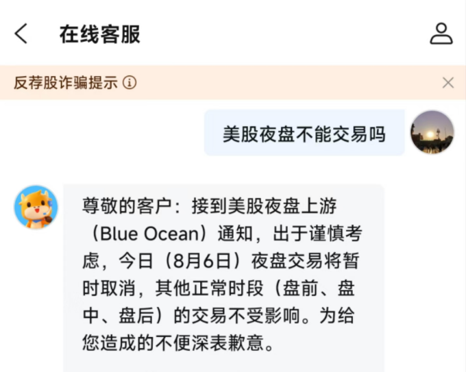 此外,8月6日,富途公告称,接到美股夜盘上游(Blue Ocean)通知,出于谨慎考虑8月6日夜盘交易将暂时取消,其他正常时段(盘前、盘中、盘后)的交易不受影响。