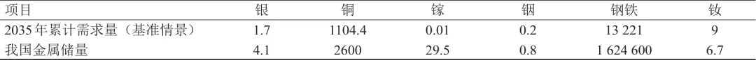 表6给出了我国新能源行业的关键金属累计需求和相应金属储量的对比。2035年,基准情景下我国新能源行业的银、铜、铟需求量分别为1.7×104 t、1.104×107 t、2000 t,分别达到探明储量的41%、42%、25%左右;钕需求量为9×104 t,已超过我国探明金属储量。镓需求量虽然占我国镓储量比例较低,但由于镓主要作为铝土矿加工的副产品和锌加工的残渣生产,而铝土矿、锌资源中只有不到10%的镓是可回收的,故镓的市场供应同样面临极高的风险。这些金属都需要从城市矿产中进行回收以保障稳定供应。