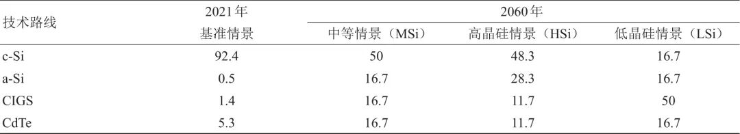 当前,c-Si、a-Si、CIGS、CdTe是4种代表性的光伏技术,但未来光伏技术发展走向依然具有不确定性。针对我国光伏市场设定了3种技术情景:基准情景、高晶硅情景(c-Si、a-Si占比较高)、低晶硅情景(CIGS、CdTe占比较高)。在不同的情景下,各类技术路线的市场份额不同(见表5);所有情景均假设市场份额呈线性变化。