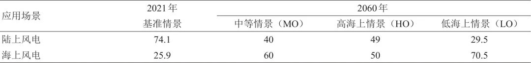 随着技术进步,风力发动机的叶轮尺寸不断增大,具有更高的塔架和更长的叶片,以捕获和转换更多的风能。2007年以来,1.5 MW风电机组成为陆上装机的主流机型,2015年后2 MW机组开始主导陆上市场,2022年新增陆上主流机型普遍为4~5 MW。2021年,陆上机组以2~4 MW为主,对应占比为陆上装机量的80%以上;海上机组以5~7 MW为主,对应占比为海上装机量的68%以上。依据未来风电行业发展趋势,设定相应市场份额(见表4),反映未来陆上和海上不同规格风电机组的占比以及金属材料用量的差异。
