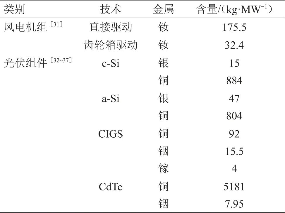 针对新能源领域材料需求和废弃量的研究主要涉及大宗材料、稀土材料。风电机组的塔架和地基大量使用钢铁和混凝土,仅到2018年我国风电行业累计材料用量即达到1.722×108 t(混凝土占75.9%、钢铁占17.9%)。对于稀土金属,2010年的国外评估表明,清洁能源设施约占世界关键材料消费量的20%,风电机组、光伏电站等使用的材料在短期内有供应中断的风险。到2030年,世界退役光伏组件的累计质量将为8×106 t;到2050年,世界退役光伏组件的累计质量将为8×107 t,超过电子废物总质量的10%。在我国,2050年光伏发电行业累计需求金属的预计值为:钢,1.414×108~1.867×108 t;铝,7.23×107~9.54×107 t;铜,1.32×107~1.74×107 t;相应需求量是2018年的17.3~22.8倍。