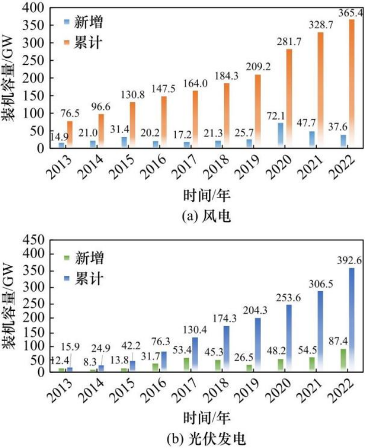 我国风电新增、累计装机容量分别在2009年、2010年升至世界首位,随后保持至今。我国风电行业先后经历3轮高速发展期,国家能源局发布的统计数据表明,截至2022年年底的风电累计装机容量约为370 GW。在光伏发电方面,2013—2022年我国累计装机容量由15.9 GW增长至392.6 GW,年均增长率约为45%(见图1);尤其是2022年,受政策利好驱动,新增装机容量为87.4 GW,达到历史高位。大力发展新能源、加快建设风电和光伏发电基地是我国碳达峰行动的规划任务,这表明从中长期看,“双碳”目标下风电、光伏发电行业仍有较大的发展空间。