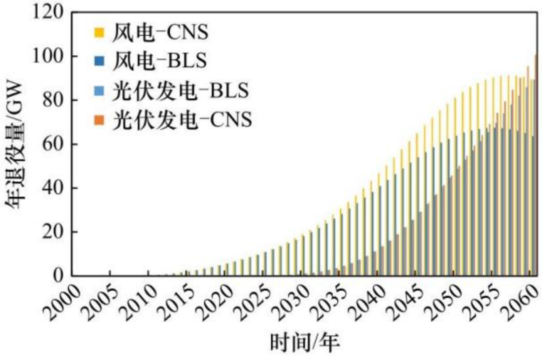 我国风电、光伏发电设备将迎来退役高峰期,2035年、2060年的合计退役量将分别为2.54×106 t、1.048×107 t(不含风力机塔筒和地基)。对于风电行业,基准情景下的2025年、2035年退役量分别为10.9 GW、28.3 GW,2030—2050年退役量较大但之后基本平稳,2060年退役量为63.7 GW;2060年,碳中和情景的退役量较基准情景提高41%。对于光伏发电行业,2025年开始逐步退役,基准情景下的2035年退役量为4.6 GW,随后退役量持续快速增长,2060年的退役量为89.5 GW;2060年,碳中和情景的退役量较基准情景提高12%。