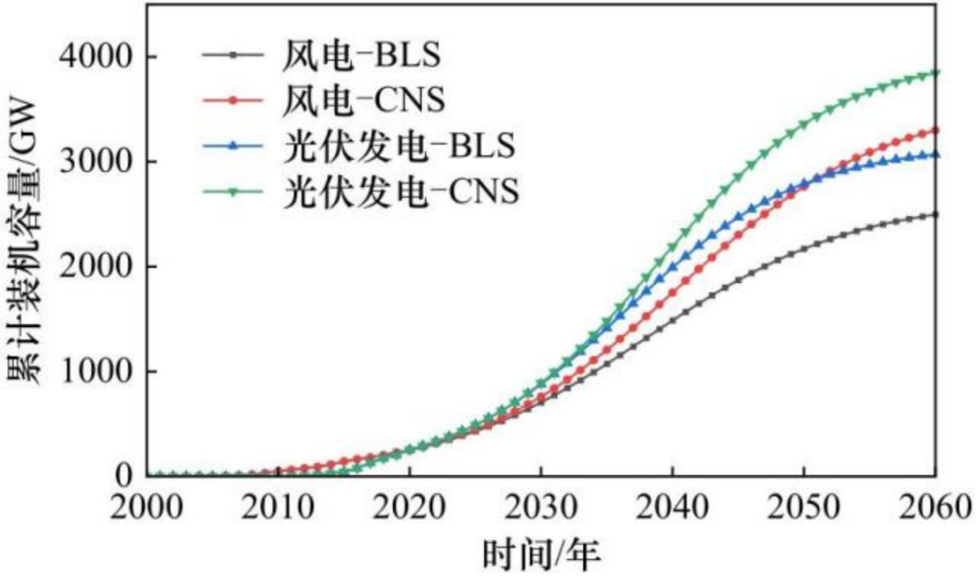 图2 不同情景下我国风电和光伏发电的累计装机容量模拟