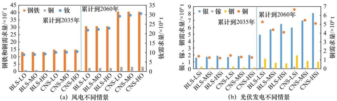我国关键金属供应将制约新能源行业发展。基准情景下风电和光伏发电行业2035年的银、铜、镓、铟、钕、钢铁累计需求量分别为1.7×104 t、1.104×107 t、300 t、2000 t、9×104 t、1.322×108 t,2060年的累计金属需求量将为2035年的2.3~4.8倍;碳中和情景下的金属需求量比基准情景增长6%~12%。在风电、光伏发电行业发展过程中(2030—2060年),从关键金属供应的角度看,钢铁为低风险等级,钕为中高风险等级,铜、银为高风险等级,镓、铟为极度危险等级。