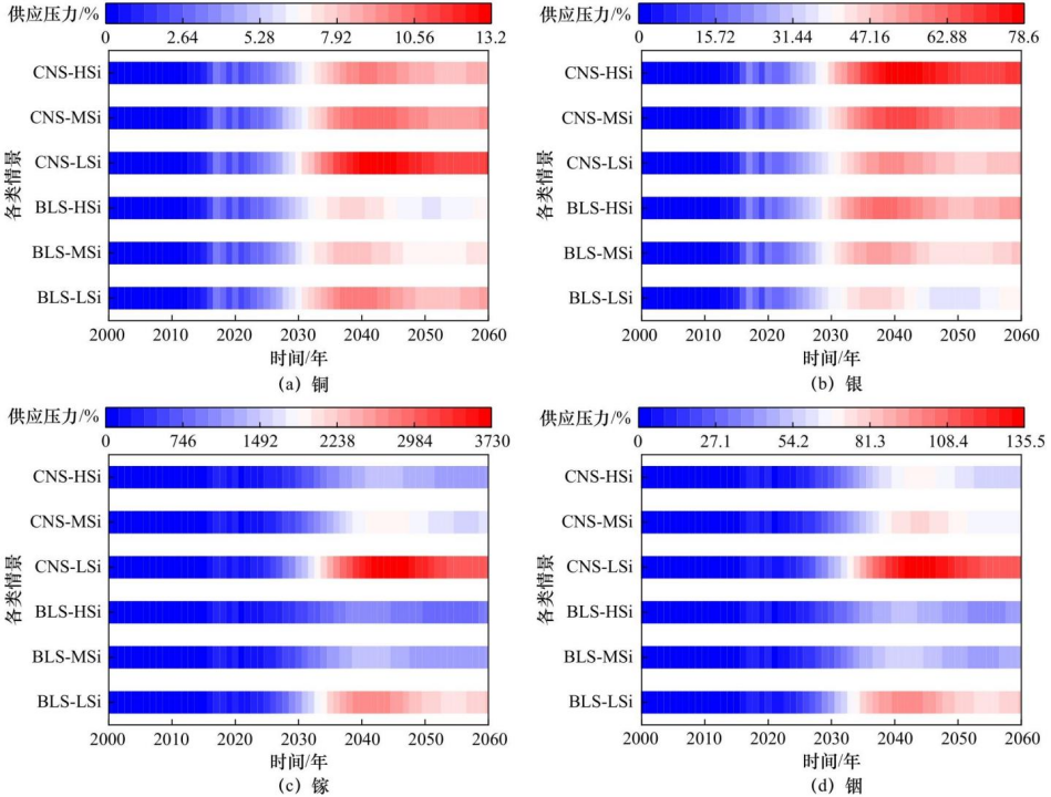 在光伏发电行业,光伏组件产能增长可能面临较大的关键金属供应压力,相应压力在2030—2060年处于较高水平,2040年左右达到峰值(见图7)。2021年,铜的供应压力为2%,银的供应压力为16%,镓的供应压力超过国内产能,铟的供应压力为4%~5%。2035年,铜的供应压力为7%~11%,银的供应压力为45%~67%,镓的需求量远超国内产能,铟的供应压力为41%~88%。2035—2060年,铜被列为中低风险(5%~25%),银被列为高风险(50%~100%),需求量超过国内产能的镓、铟被列为极度危险(3722%、135%)。薄膜电池中的CIGS、CdTe生产需要金属,LSi下金属供应压力明显增大。