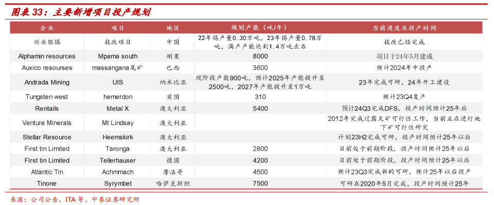 中长期看,2025年之前新增产能有限。2010年到2019年锡价波动中枢在150000元/吨左右,企业投入资本和建设的动力下降,锡矿资本开支处于低位。增量主要来源于中国的银漫矿业技改及二期项目、刚果(金)的Bisie Mpama south、巴西的Massangana尾矿以及纳米比亚的UIS等,其他很多项目多处于FS之前的阶段,预计投产时间或将在2025年之后: