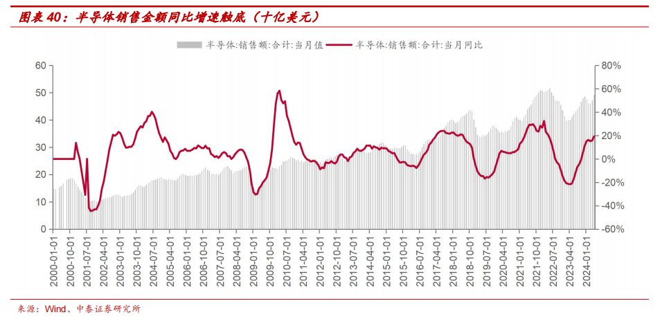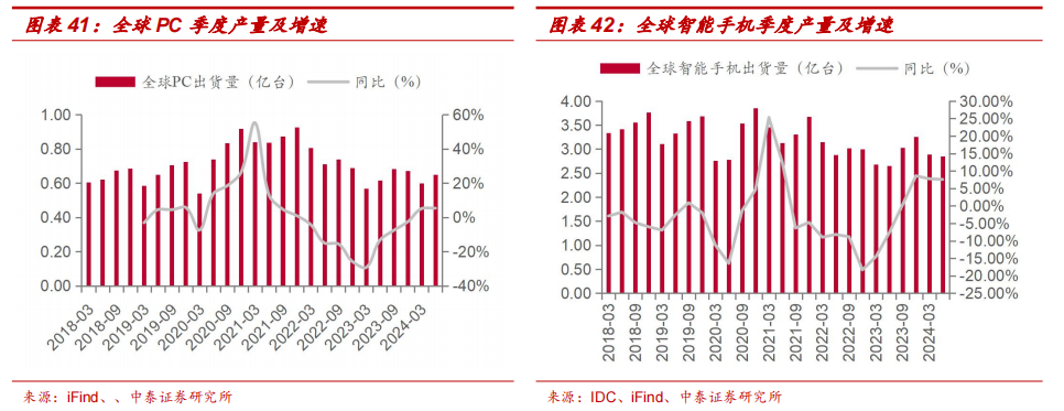此外,半导体行业呈现周期性特征,半导体销售金额同比增速于2022年9月开始转负,23年5月半导体销售额增速出现见底向上趋势,23年11月同比增速开始转正。24Q2全球智能手机出货2.85亿部,同比增长7.58%,需求继续修复;全球PC出货量0.65亿台,同比增长5.36%。