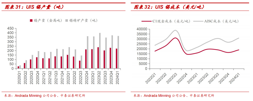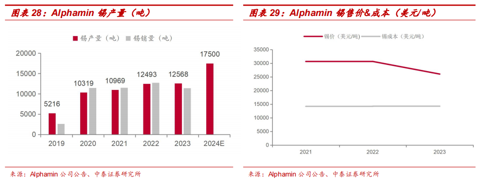 刚果(金)Mpama south矿(Alphamin):Mpama South矿推断矿石储量284万吨,锡品位2.42%,含锡6.87万吨。23年锡产量12568吨,销量11385吨,主要是由于强降雨导致运输受到影响。原计划23年底将产能从12000吨扩张至20000吨,但由于入境道路状况不佳导致物流延误,投产时间推迟至2024年5月,24年产量指引17000-18000吨。
