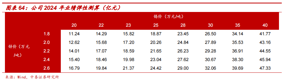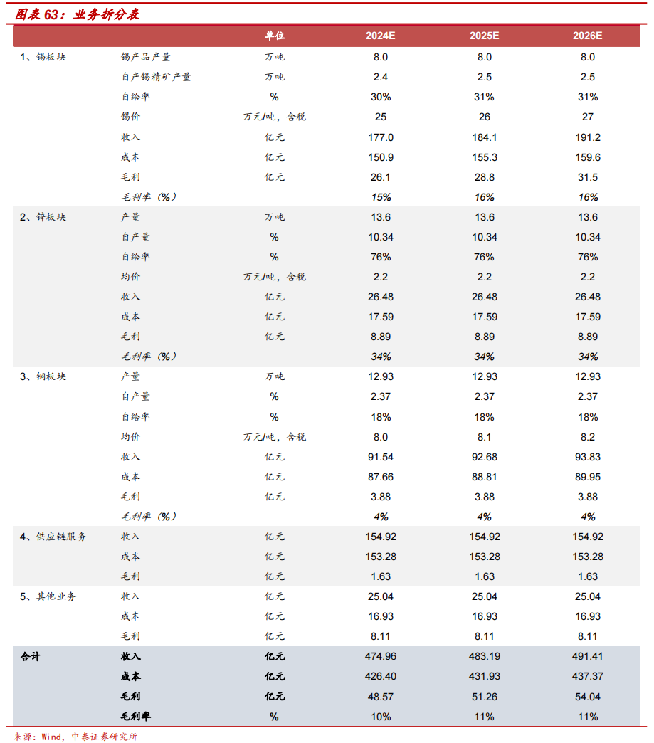 锡:假设24-26年锡价(含税)分别为25、26、27万元/吨,锡产量分别为8.0、8.0、8.0万吨,自产矿分别为2.40、2.45、2.50万吨;