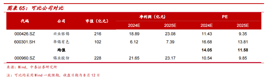华锡有色主营业务以锡锌锑为主,兴业银锡主营业务以锡锌银为主,与锡业股份主营产品具有较大的一致性,因此选择这两个标的作为可比公司,公司估值低于可比公司,业绩有望充分受益于锡价中枢上行,维持公司“买入”评级。