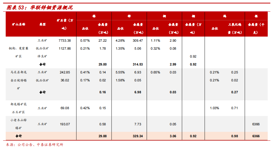 资源:华联锌铟拥有四宗采矿权,包括马关县都龙金石坡锌锡矿(生产规模10万吨/年,锌锡矿)、铜街、曼家寨矿区(生产规模360万吨/年,锌锡矿)、都龙锡矿花石头矿区(生产规模3万吨/年,锡钨矿)、小老木山锌锡矿(生产规模3万吨/年,锌锡矿),合计拥有锡资源量29.88万金属吨,锌资源量329.24万金属吨,铟资源量0.92万金属吨,铟储量居全国第一,锡储量居全国第三,锌储量居全省第三;