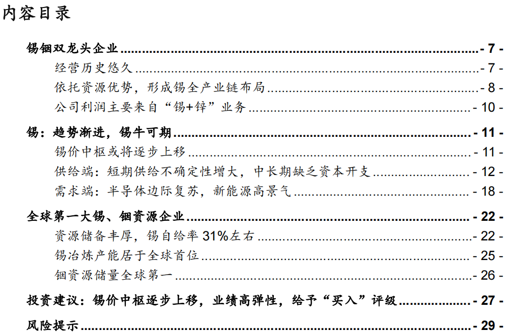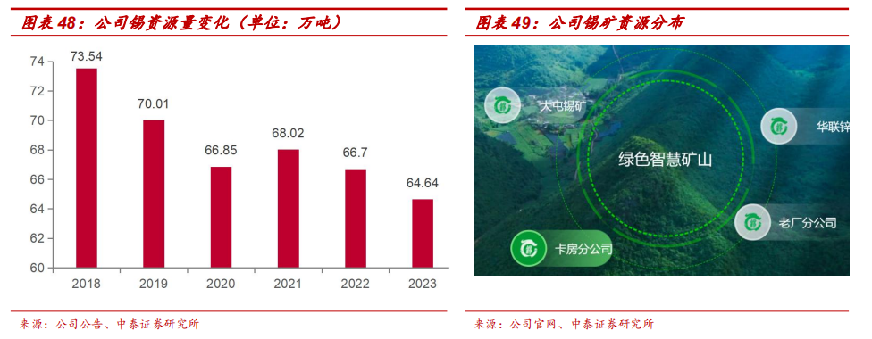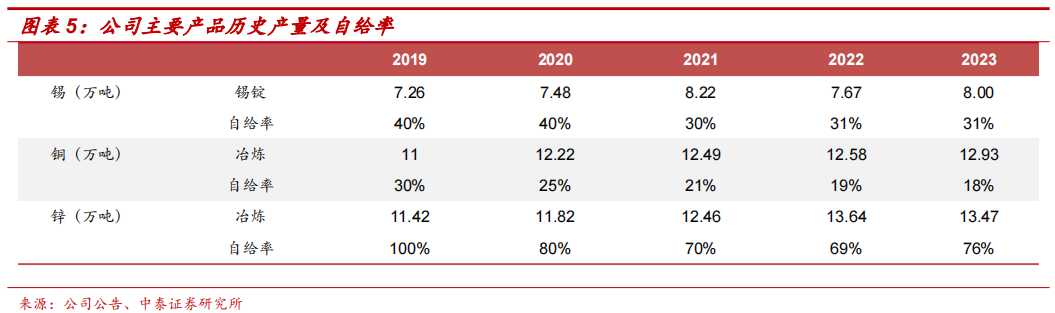 公司经营历史悠久,为锡铟双龙头企业。公司前身始于清光绪九年(1883年)朝廷拨官款建办的个旧厂务招商局,历经141年的积淀与发展,当前具有集锡、铟、锌、铜等有色金属资源探采、选冶、深加工以及新材料研发、贸易全产业链供应链一体化的产业格局,锡、铟资源储量均居全球第一,拥有中国最大的锡生产、加工基地,拥有世界上最长、最完整的锡产业链。截至23年底,公司锡资源量64.64万金属吨、铜资源量116.72万金属吨、锌金属量376.28万吨、铟4945吨、三氧化钨量7.75万吨、铅金属量9.54万吨、银2491吨。