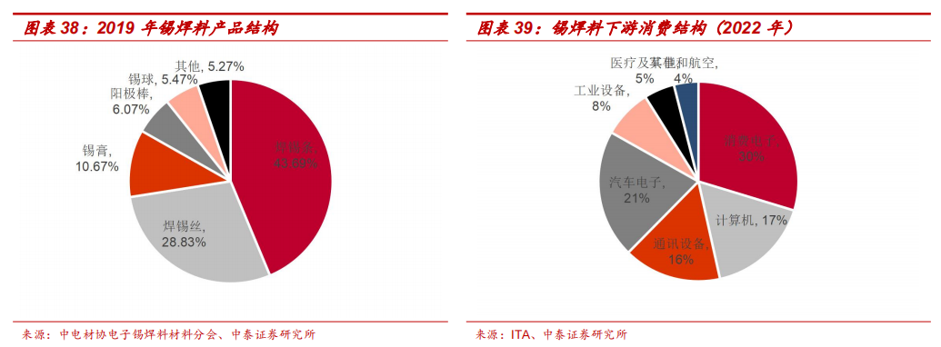 焊料是锡最主要的应用领域,与半导体周期紧密相关。电子锡焊料主要起连接、导电、导热的作用,主要包括以下几大类型:锡膏(主要用于回流焊接)、焊锡条(主要用于波峰焊接)、焊锡丝(主要用于手工焊接)、BGA球、预成型焊片、助焊剂等,其中锡焊条与锡焊丝是最大的细分品类。终端应用来看,电子锡焊料主要应用于PCBA、半导体分立器件、精密结构件及光伏组件等产业环节,根据ITA数据,22年锡焊料消费结构中,消费电子占比30%、通信占比16%、计算机占比17%、汽车电子占比21%、工业设备占比8%。