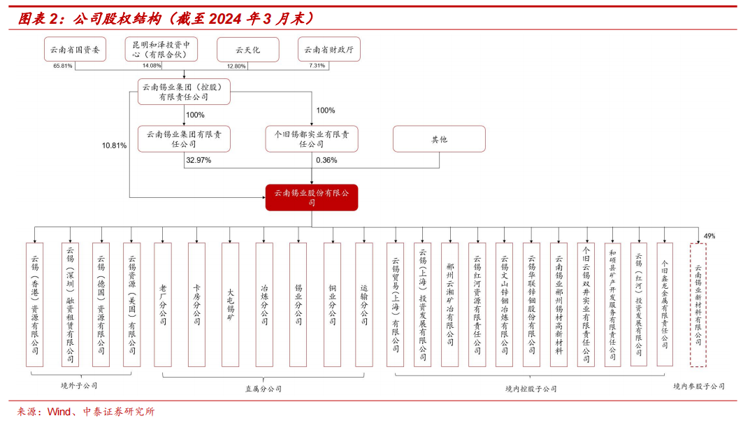 股权结构:公司实际控制人为云南国资委,控股股东为云南锡业集团(控股)有限公司,直接持有公司10.81%股权,通过云南锡业集团有限责任公司持股32.97%,合计持股43.78%。