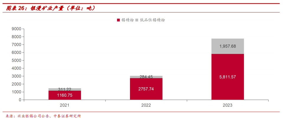 银漫矿业(兴业银锡):银漫矿业的增量主要来自技改和二期项目。一期生产规模165 万吨/年(其中处理铅锌矿石25万吨、铜锡矿石140万吨),2022年锡产量3042吨,自 2023 年起拟采的富锡低硫型原矿,锡品位将由0.76%提升至 1.2%,锡回收率由44%提高至60%,23年锡产量7769吨,同比增长155%。此外,目前二期正在办理自治区立项手续,二期投产后届时合计矿石处理产能将达到近297万吨/年。