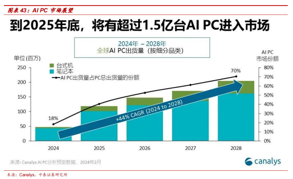 AI打开新的应用场景,半导体周期有望触底回升。AI的发展将会驱动算力需求高增长,并进一步推动锡需求增长。以算力芯片为核心的硬件基础设施是AI发展的基石,尤其是ChatGPT的出现推动AI加速发展, AI应用场景将更为丰富,需要大量的硬件设备给予算力支持。厂商纷纷入局AIPC市场,Canalys预测,2024 年,全球AI PC 出货量将达到 4800 万台,占总出货量的18%,预计到2025年,AI PC出货量将超过1亿台,占PC总出货量的40%,AIPC的发展有望提升消费电子的增速。