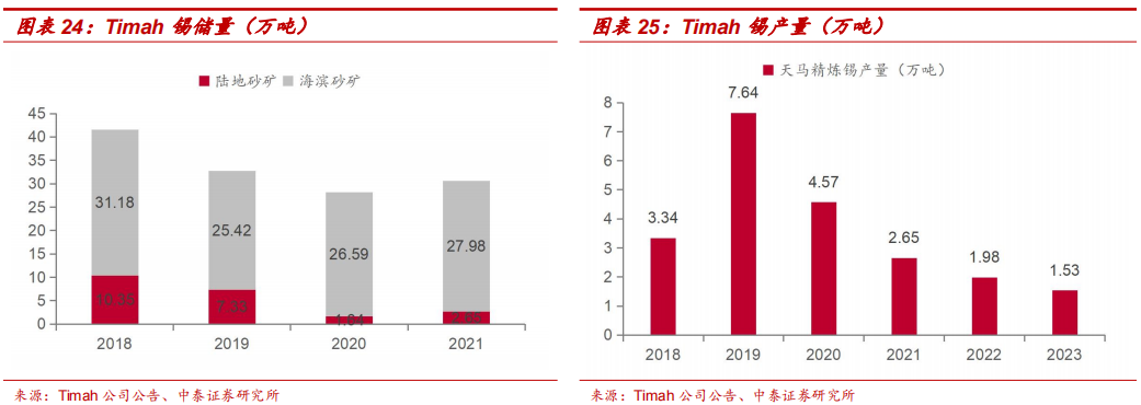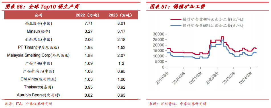 公司层面:锡业股份是锡、铟双龙头公司,锡全球市占率20%以上,铟储量居于全球首位。截至23年报,公司锡资源量64.64万吨,拥有锡冶炼产能8万吨/年,原料自给率31%左右,公司业绩将充分受益于锡价向上的弹性。