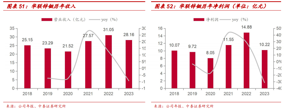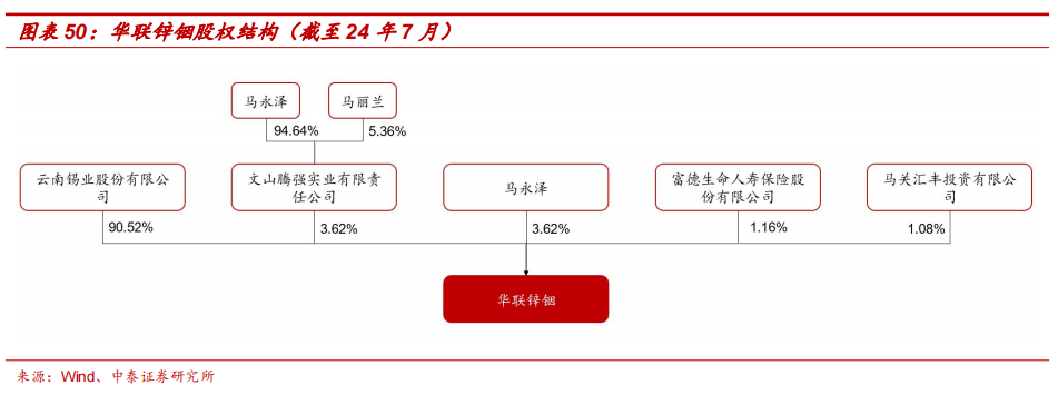 华联锌铟:其前身为“文山州都龙锡矿”,始建于1958年4月;2003年3月15日,公司以发起方式设立“云南文山都龙锌锡有限责任公司”;2004年,由云南文山都龙锌锡有限责任公司整体变更设立云南华联锌铟股份有限公司,云锡集团持股20%;2015年,云南省国资委同意锡业股份按每股11.8元的价格购买云南华联锌铟股份有限公司75.74%股权;其后不断提升持股比例,截至23年报,公司持有华联锌铟90.52%股权。2023年华联锌铟实现营业收入28.16亿元,实现净利润10.22亿元,同比下降31.3%,净利率为36%,为锡业股份主要利润来源之一,净利润同比下降主要系锌价走弱及转固折摊成本增加影响。