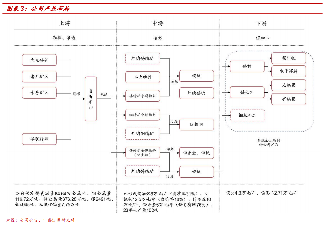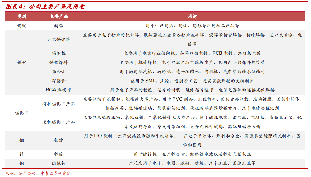 公司具有集锡、铟、锌、铜等有色金属资源探采、选冶、深加工以及新材料研发、贸易全产业链供应链一体化的产业格局,锡、铟资源储量均居全球第一,拥有中国最大的锡生产、加工基地,拥有世界上最长、最完整的锡产业链。公司主要产品包括锡锭、锡材、锡化工、锌锭、锌合金、阴极铜、铟锭等产品。