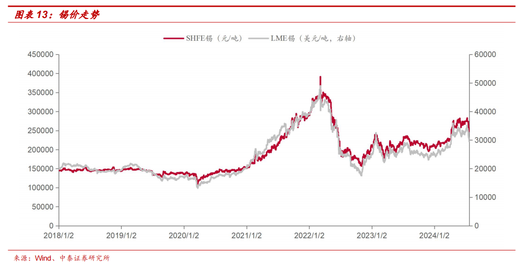锡:趋势渐进,锡牛可期。2024年以来锡价强势上涨,主要受多因素影响: