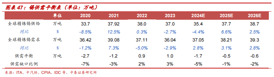 我们预计2024-2026年全球锡消费量为37.05、38.21、39.28万吨,同比增长2.8%、3.1%、2.8%;24-26年锡供给量为35.4、37.7、38.7万吨,同比分别增长-4.4%、6.6%、2.5%,24年供给主要下修了缅甸以及印尼供应量,供给短缺5%左右,维持紧平衡格局,锡价中枢或将逐步上移。