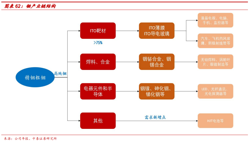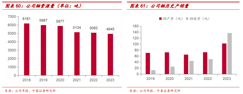 铟:具有铟资源量4945吨,作为国内最大的原生铟生产基地, 2023年实现铟锭产量102吨,销售量137吨。