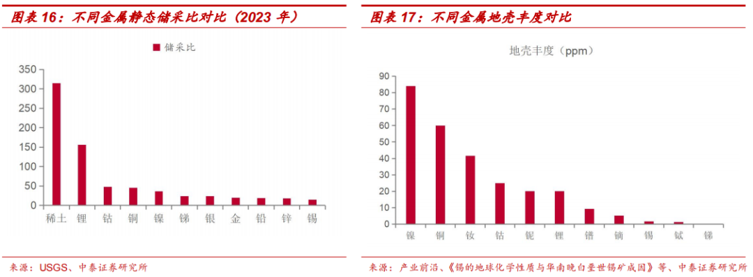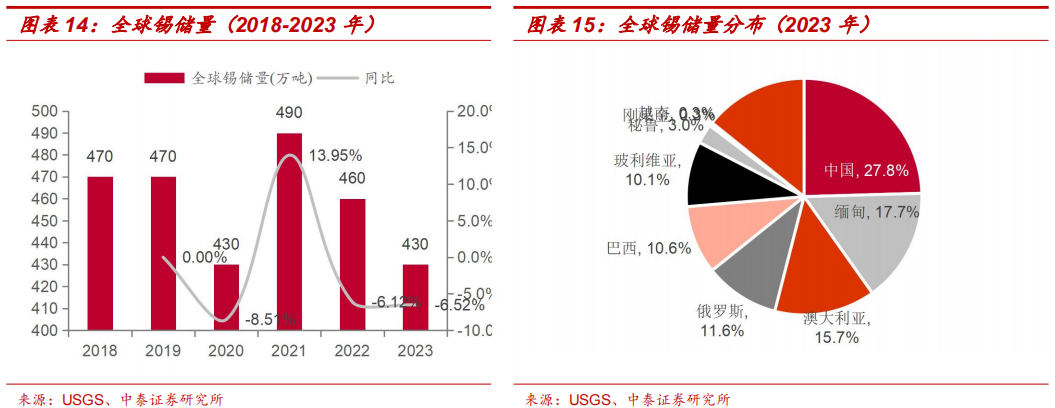 资源端极具稀缺性。锡在地壳中含量较少,根据美国地质调查局(USGS),2023年全球锡储量为430万吨,其中:中国锡储量110万吨,占全球总储量的27.8%;缅甸锡储量为70万吨,全球占比17.7%;澳大利亚锡储量62万吨,占比15.7%。