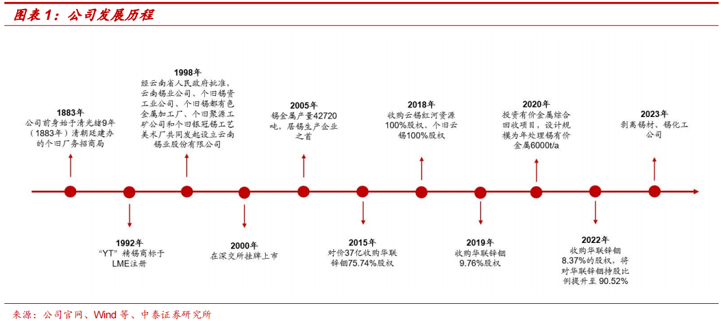 公司前身始于清光绪九年(1883年)朝廷拨官款建办的个旧厂务招商局; 1998年经云南省人民政府批准,云南锡业公司、个旧锡资工业公司、个旧锡都有色金属加工厂、个旧聚源工矿公司和个旧银冠锡工艺美术厂共同发起设立云南锡业股份有限公司;2000年在深交所挂牌上市。历经141年的积淀与发展,形成了锡、铜、锌、铟、锡材、锡化工及其他有色金属深加工纵向一体化的产业格局,拥有行业内完整的锡产业链,为我国最大的锡生产加工基地。截至23年底,公司锡资源量64.64万金属吨、铜资源量116.72万金属吨、锌金属量376.28万吨、铟4945吨、三氧化钨量7.75万吨、铅金属量9.54万吨、银2491吨。