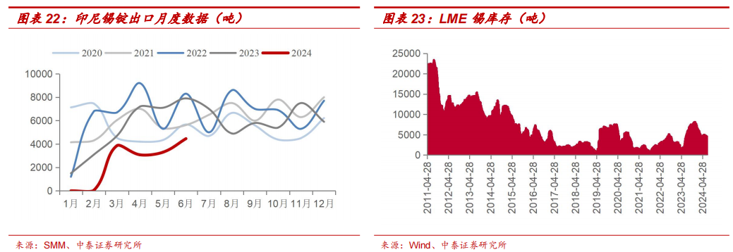 2)供给端:缅甸佤邦23年8月开始停止采矿,但中国从缅甸进口锡矿量并未明显下滑,主要系在消化佤邦库存所致,随着佤邦库存降至低位,4月开始进口量已经大幅下降;24年一季度由于印尼大选,导致当地RKAB审批较慢,印尼锡锭出口量显著低于去年同期,LME库存持续去化至历史低位。