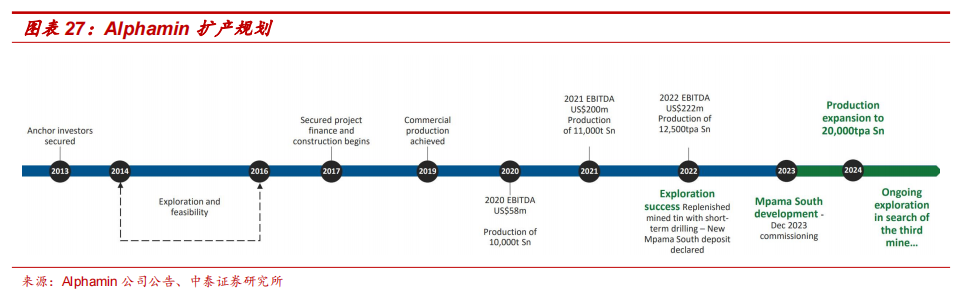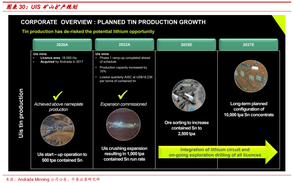 纳米比亚UIS矿山(Andrada Minning):位于纳米比亚的UIS锡矿是全球最大的锡矿之一,2017年Andrada收购该矿山,其矿石资源量715.4万吨,含锡量达到9.5万吨。公司将分两个阶段逐步提高产量,第一阶段的提升工作已经提前完成,目前锡产量已经达到每年1000吨。公司规划到2025年锡产量将增至2500吨/年,到2027年锡精矿产能10000吨/年。