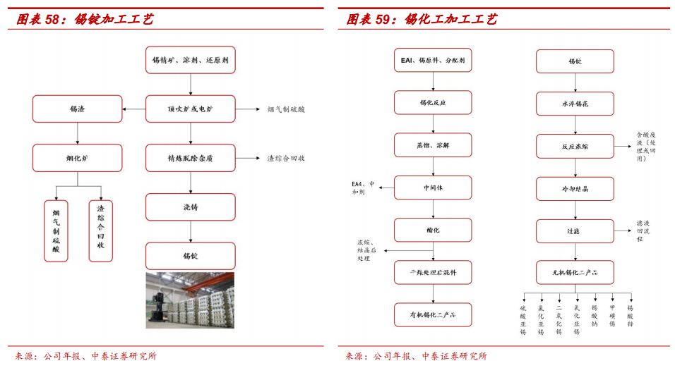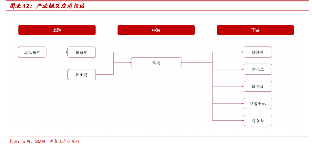 锡是一种有银白色光泽的金属元素,在工业和生活应用广泛,现已成为我国的战略资源,是不可或缺的关键稀有金属。锡产业链主要包括锡矿采选、精锡冶炼加工到终端消费等环节。资源端主要包括原生锡矿和砂锡矿,经过采选、冶炼以及深加工后得到精锡产品、锡铅焊料锭、锡基铸造合金锭等,最终形成锡焊料、各种锡材、锡化合物等产品,应用于电子、电镀、食品、玻璃、医药、汽车、光伏等领域。