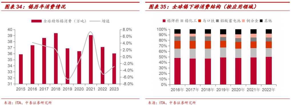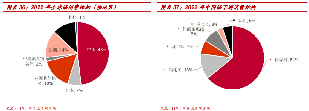 锡下游消费与半导体周期相关性较强。锡具有熔点低的特点,适合作为电子品的焊接材料,根据ITA数据,2022年全球锡需求结构中,焊料领域约占50%,锡化工/马口铁/铅酸电池占比分别为16%/12%/7%。国内下游需求中,焊料占比达到64%左右,锡化工品占比13%,马口铁占比7%左右。