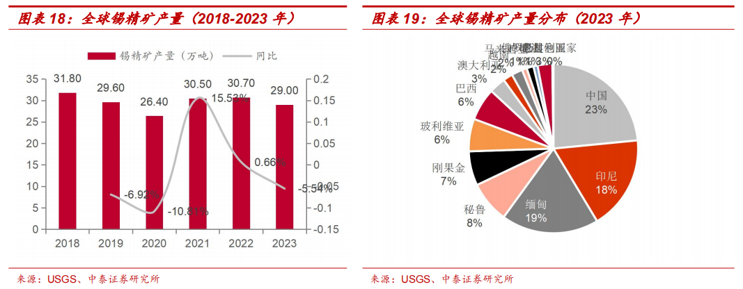 全球锡精矿产量稳定,分布高度集中。近年来,全球锡精矿产量稳定在30万吨左右,根据USGS 2023年统计数据,中国是锡精矿的主要生产国,产量占比23.45%;其次是印尼占比17.93%;缅甸占比18.62%。