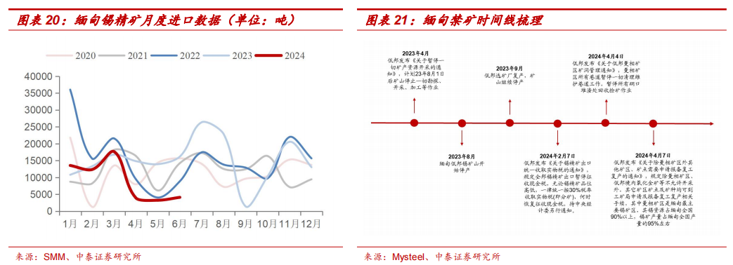 缅甸:2023年4月缅甸佤邦政府出台文件要求2023年8月1日后矿山停止一切勘探、开采、加工等作业;24年2月7日,佤邦计划对所有锡精矿征收30%实物税,此前品位20%以内精矿征收现金税;2024年4月7日,佤邦发布《关于除曼相矿区外其他矿区、矿点需要申请报备复工复产的通知》,除曼相矿区外,其他矿区可以申请复产手续,但曼相矿区是缅甸最主要锡矿区,其锡资源占缅甸全国90%以上,锡矿产量占缅甸全国产量的95%左右,具体采矿复产时间仍未明确。此外虽然23年8月佤邦矿山停止开采,但23年9月当地选矿复产,主要消化库存为主,叠加抛储导致我国从缅甸锡精矿进口量并未明显收缩,23年9月-24年6月,我国从缅甸进口锡精矿合计10.03万实物吨(折合约2.01万金属吨),随着佤邦库存降至低位,4月开始从缅甸进口量已经大幅收缩。