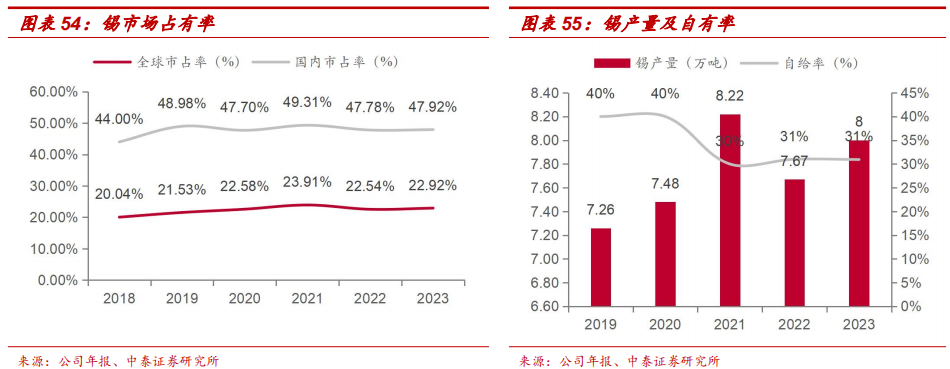 公司拥有锡冶炼产能8万吨/年,合资子公司锡材产能4.3万吨/年、锡化工产能2.71万吨/年。2023年公司生产锡金属8万吨,原料自给率31%,国内锡市场占有率47.92%,全球锡市场占有率22.92%。