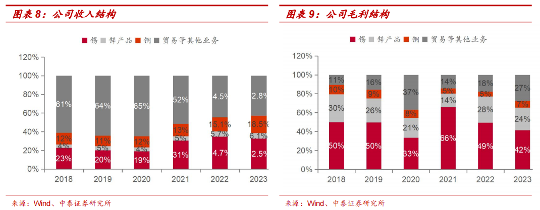 从毛利来看,2023年实现毛利38.77亿元,其中锡业务实现毛利16.12亿元,占比42%;锌产品实现毛利9.17亿元,占比24%;铜产品实现毛利2.84亿元,占比7%;贸易及其他业务实现毛利10.64亿元,占比27%。